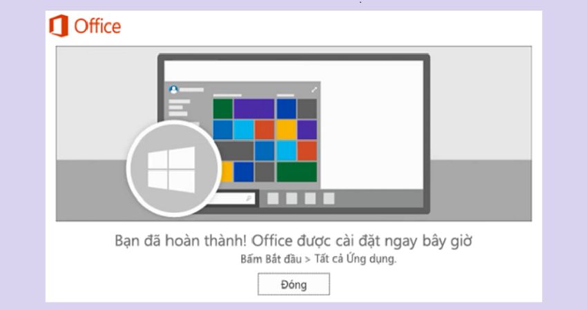 Bước 2: Chờ hệ thống hoàn tất cài đặt. Khi xuất hiện thông báo "Bạn đã sẵn sàng! Office giờ đã được cài đặt", chọn "Đóng"